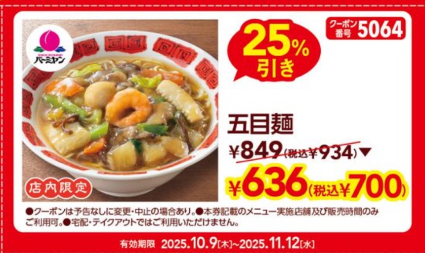 今日のランチはすかいらーくの株主優待券を利用してバーミヤンで、五目麺をいただきました。