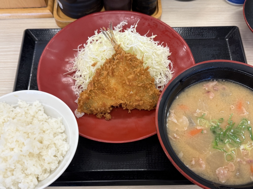アークランズの株主優待を利用して、かつやで豚汁とアジフライ、千切りキャベツをいただきました。