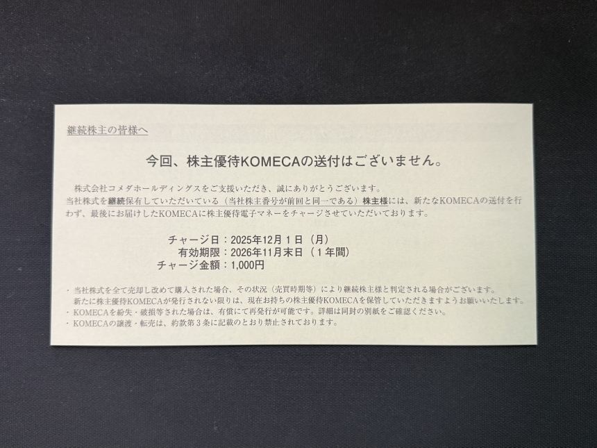 • 202511 株主優待 コメダ 20251127