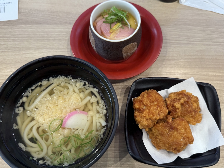 今日のランチは、コロワイドの株主優待を利用して、かっぱ寿司でかけうどんと醤油から揚げ、合鴨ロース茶碗蒸しをいただきました
