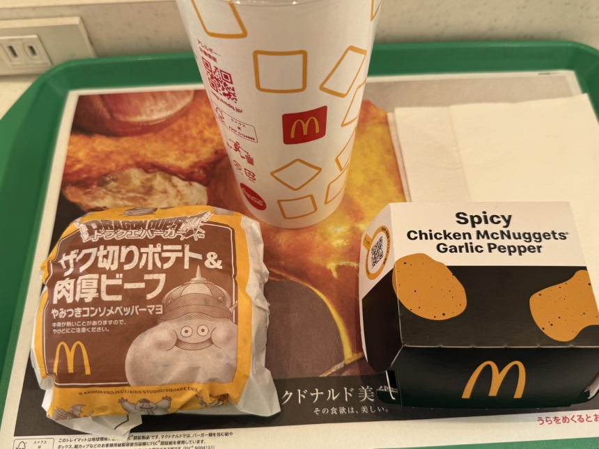 今日のランチは、マクドナルドの株主優待で、ザク切りポテト&肉厚ビーフ、スパイシーチキンマックナゲット、野菜生活Lサイズをいただきました。