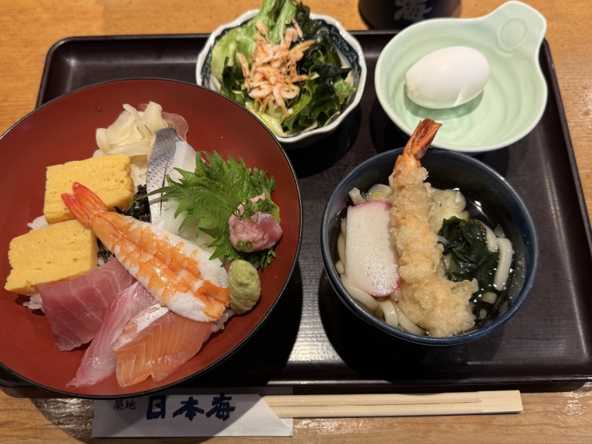 今日のランチは、大庄の株主優待券を利用して、築地日本海で日替り定食(七種の海鮮丼と海老天ぷらうどん)をいただきました。