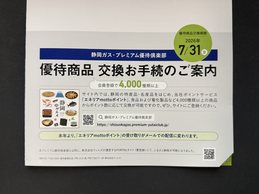 20260306日、静岡ガスより株主優待の案内が届きました。