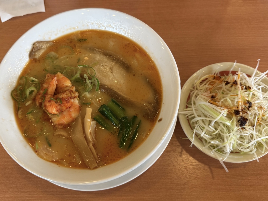 今日のランチは、幸楽苑の株主優待を利用してエビ味噌らーめん、千切りネギをいただきました。