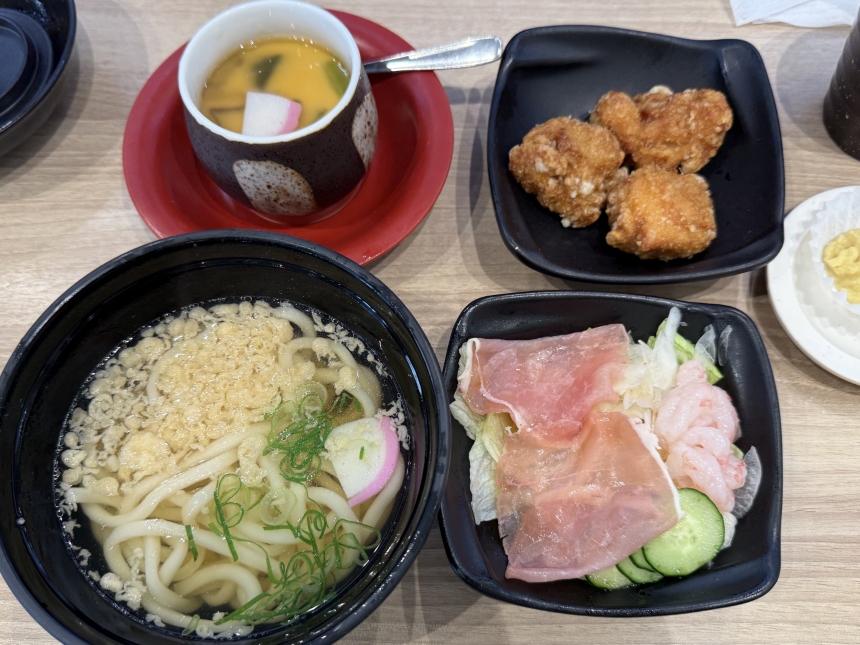 今日のランチは、コロワイドの株主優待を利用して、かっぱ寿司でかけうどん、生ハムと甘海老サラダ、茶碗蒸しをいただきました