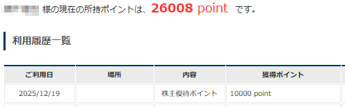 20251219日、コロワイドより株主優待ポイントが付与されました