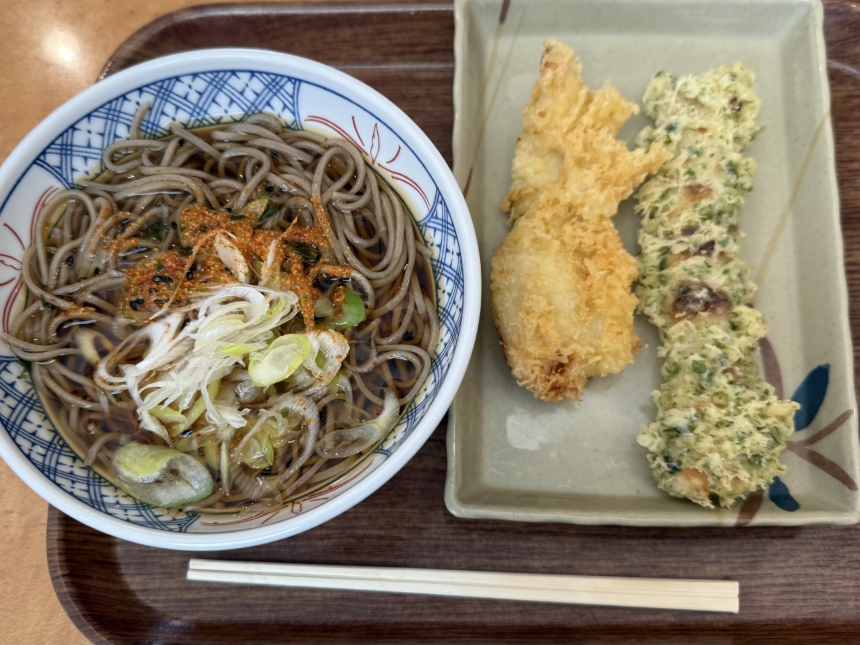 今日のランチは、クリエイトレストランツHDの株主優待券を利用して、肉麺右衛門のかけ蕎麦、とり天、ちくわ天をいただきました。