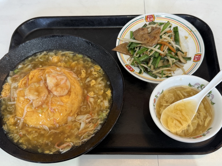 今日のランチは、王将フードサービスの株主優待券で、極王天津飯、ニラレバ炒めをいただきました。