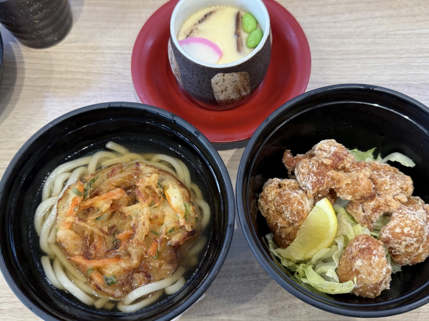 今日のランチは、コロワイドの株主優待を利用して、かっぱ寿司で野菜かき揚げうどんと特盛から揚げ、茶碗蒸しをいただきました