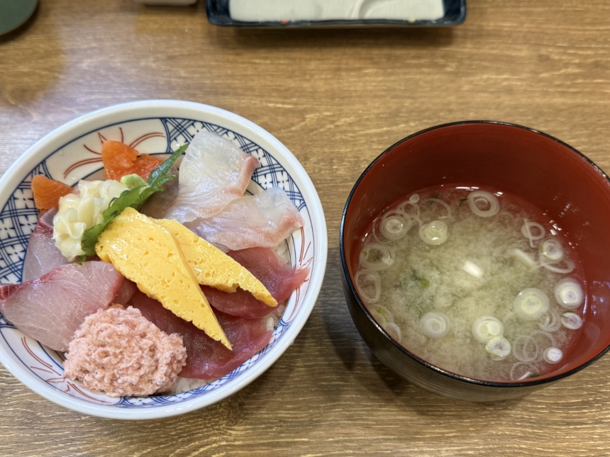 今日のランチはSFPHDの株主優待券を利用して、磯丸水産の海鮮こぼれ丼と生海苔味噌汁をいただきました。